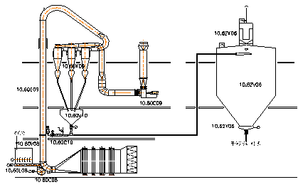 ⑶ 離心風機正壓吹送是稀相輸送,主要是設計好輸送風量、固氣比、風壓、輸送管道直徑、卸料旋風分離器。輸送量為16.67t/h,風速為35m/s,物料密度為0.1%。