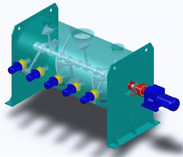 混合機結構主要由傳動部分、臥式筒體、犁刀組軸、飛刀組、出料閥、噴液裝置等組成。
